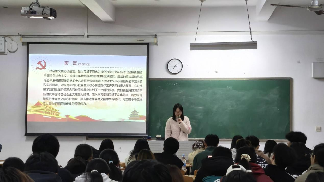 杨韫幔老师从科学内涵、发展历程、重大意义和培育践行四个方面对社会主义核心价值观进行全面阐述,使同学们深刻理解了社会主义核心价值观的核心要义。杨老师强调青年当不负时代重托、不负青春使命,牢牢把握时代脉搏与发展机遇,以社会主义核心价值观为根本遵循,将其内化于心、外化于行,勇担时代赋予青年的责任使命,主动投身社会主义现代化建设的伟大实践,以青春之我、奋斗之我书写无愧于时代的青春华章。
