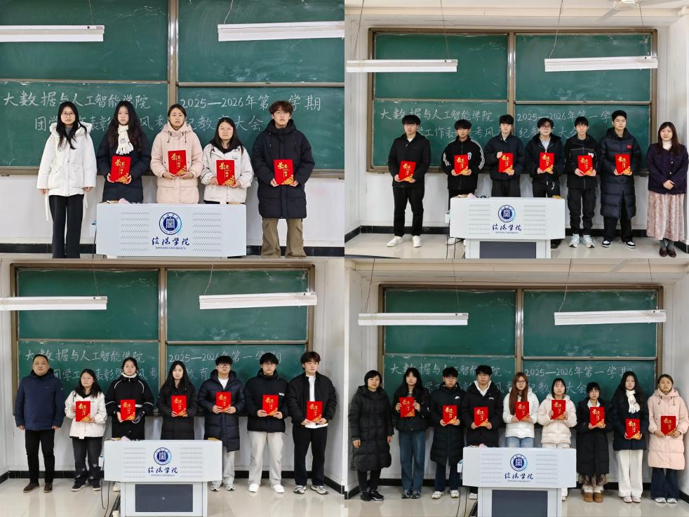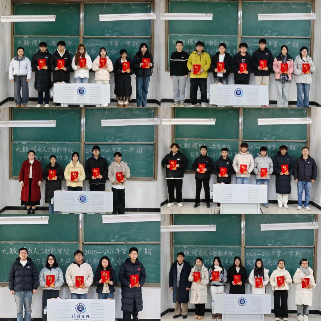 为全面总结本学期团学工作成绩,表彰先进集体与个人,部署期末考风考纪教育工作,进一步凝聚共识、严肃学风,2026年1月4日下午,大数据与人工智能学院在人文楼108教室隆重举行2025-2026学年第一学期团学工作总结表彰暨考风考纪教育大会。学院党总支书记高昌慧、学工干事鄢杰、团总支书记徐瑞爽、全体辅导员及学生干部代表出席大会。会议由徐瑞爽主持。