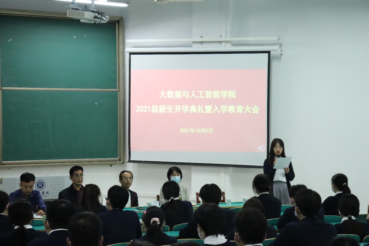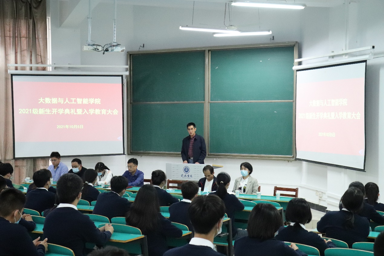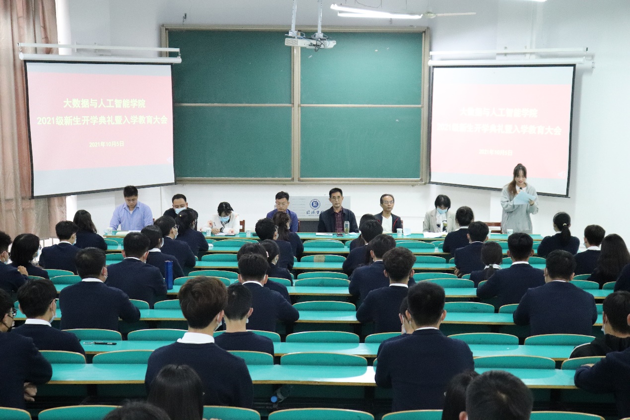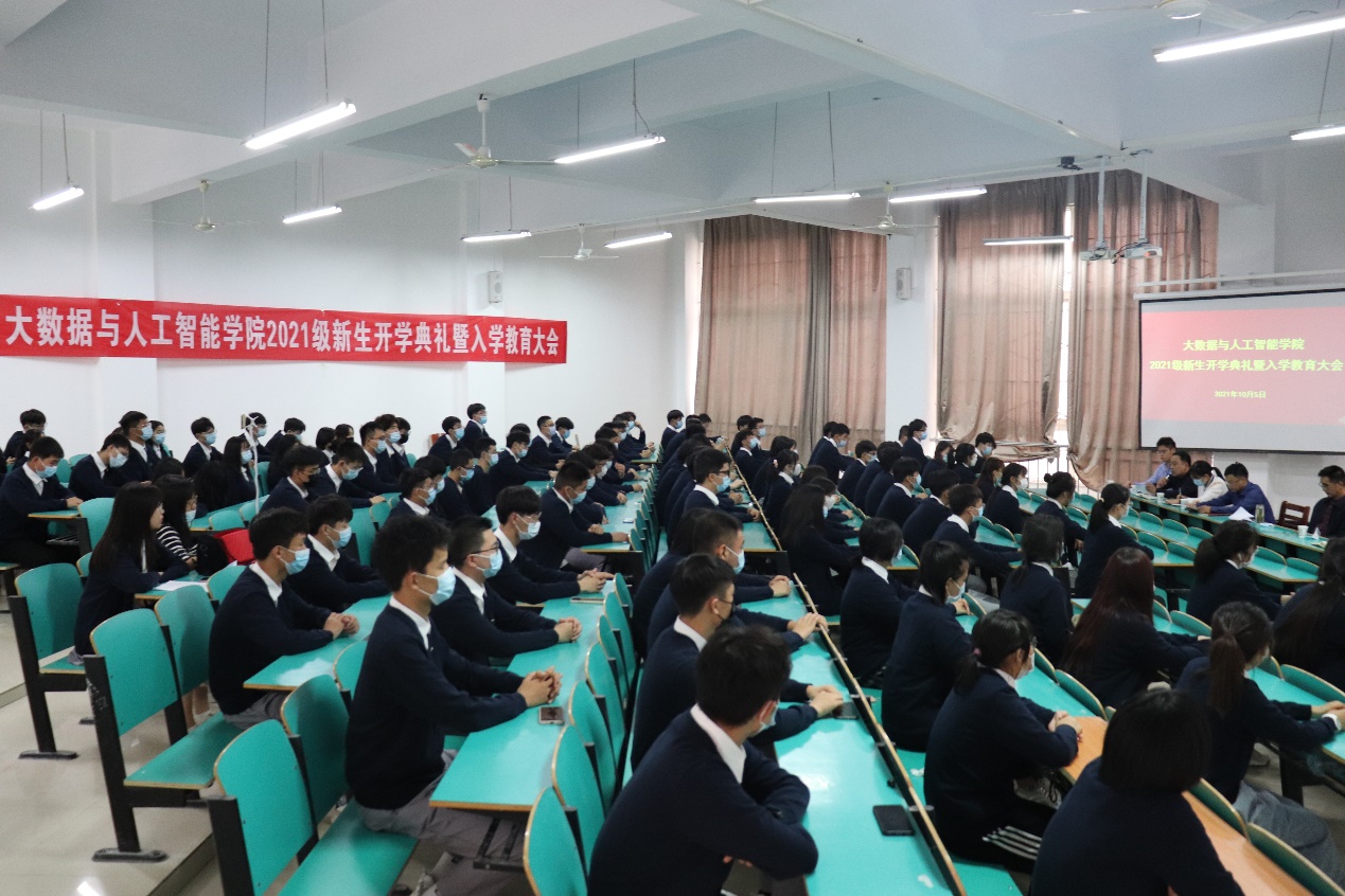 10月5日下午,大数据与人工智能学院2021级新生开学典礼暨入学教育大会在数计楼207(主会场)、204、208、209(分会场)举行,会议是采取线上线下相结合的方式开展。学院院长邬长安、党总支副书记毛凤翔、教学副院长黄俊,教学秘书贾彦茹、学工干事鄢杰,行政干事司杰,辅导员代表沈鹏超、教师代表郭晶晶和2021级全体新生参加了会议。会议由毛凤翔主持。