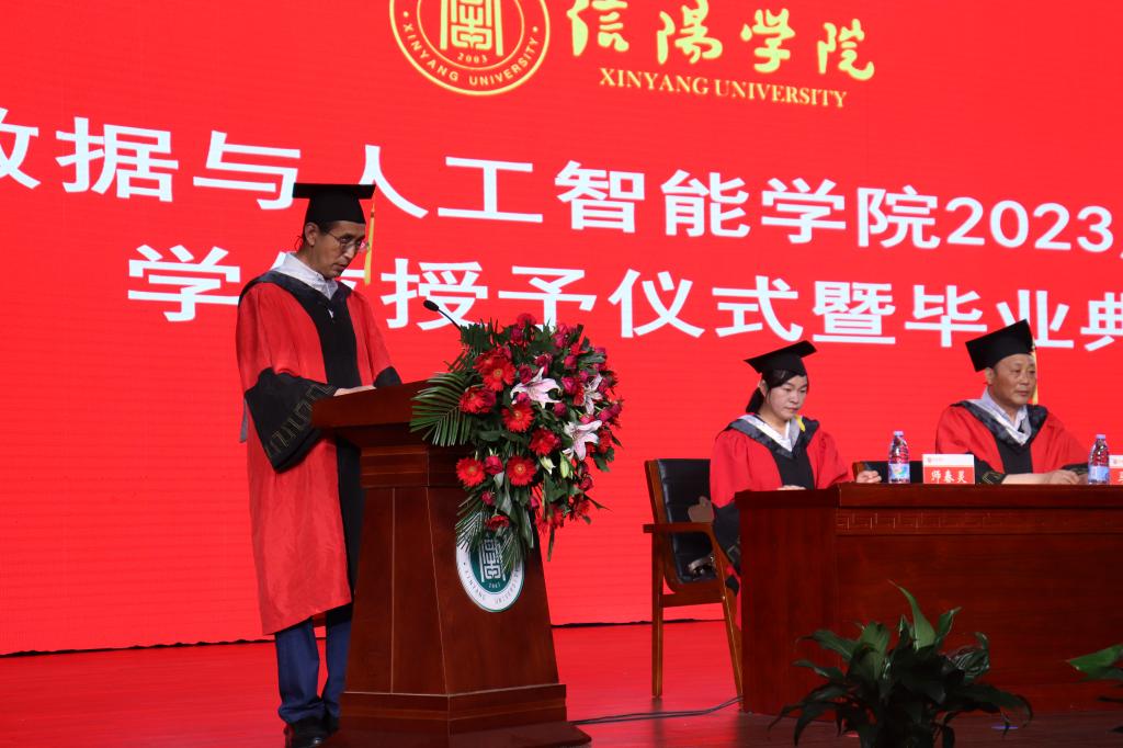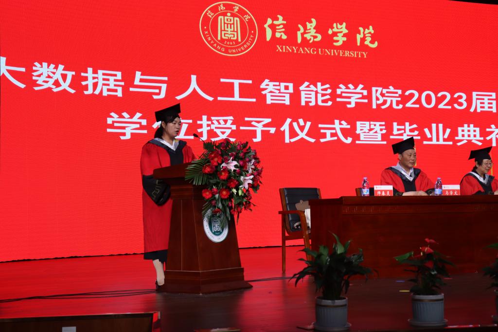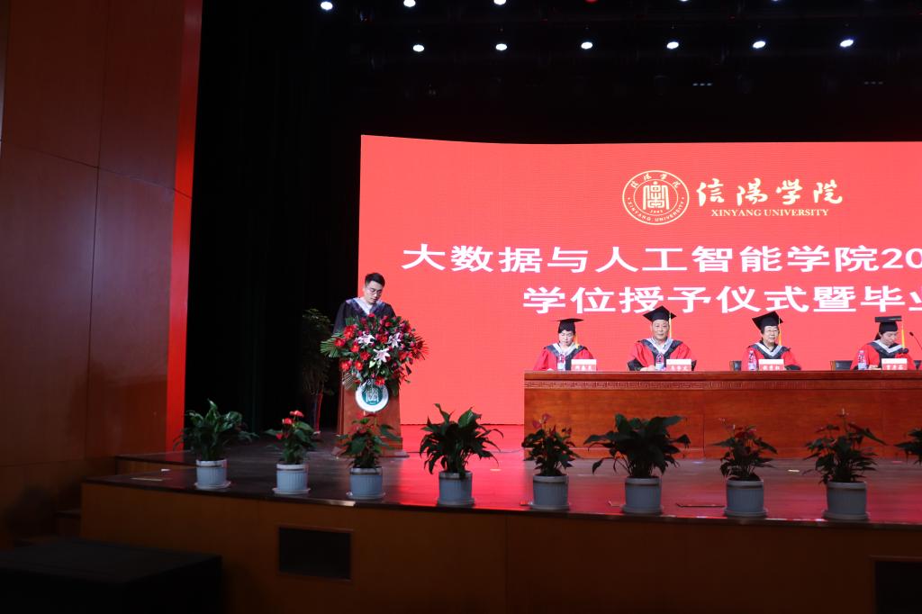 院长邬长安发表了毕业致辞,他首先代表学院向圆满完成学业的毕业生表示祝贺,2023届毕业生见证了大数据与人工智能学院发展的过程,是学院事业进步的参与者、实践者、贡献者、推动者。邬长安院长对在人生的重要转折点即将开启新征程的同学们提出几点希望:一是希望同学们胸襟开阔,奋发有为,做一个堪当大任的奋斗者。同学们赶上好时代,但时代也会带来挑战,同学们遇到困难挫折时,要百折不挠,奋发有为。 二是希望同学们勇于担当,善于学习,做一个不断进取的奋斗者。在大数据,云计算、人工智能等新技术快速发展的时代,要“会”学习,不断创新,自觉将实现自我价值的过程融入到社会发展和国家发展的进程中,开辟属于自己的新天地。三是希望同学们脚踏实地,不懈奋斗,做时代发展的成功者。“路虽远,行则将至;事虽难,做则必成。”希望同学们扎扎实实走好每一步,认认真真做好自己的每一件事,一步一个脚印,砥砺前行,谱写美好的人生华章。