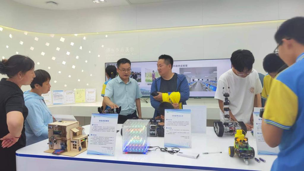 活动中,大数据与人工智能学院教学副院长毛凤翔为学生及家长讲解了对话交互机器人及人工智能未来的发展前景。同时学生们被分成小组,在其他老师和志愿者的带领下轮流参观并参与动手实践。跟随着讲解员的脚步,孩子们有序参观了STM32单片机心率计、3D飞机智能姿态模型、交叉足机器人等一系列生动有趣的人工智能产品。许多学生纷纷表示,这次活动让他们对未来的学习方向有了更清晰的认识,也更加坚定了投身科学研究的梦想。