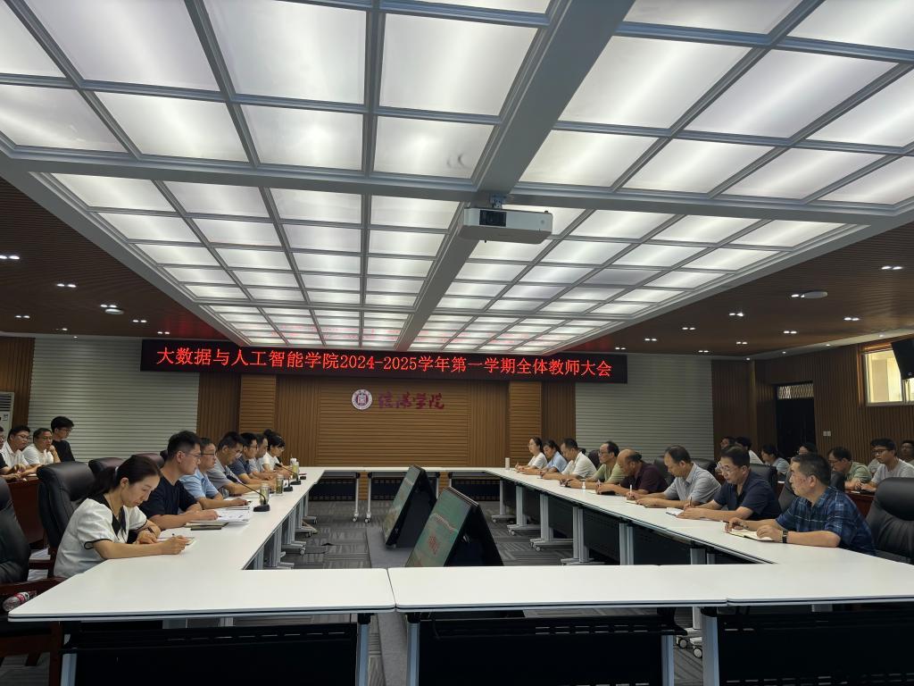 9月1日下午,大数据与人工智能学院在人文楼208召开2024-2025学年第一学期全体教师大会,安排部署新学期工作。院长邬长安、党总支书记郭二军、教学副院长毛凤翔、教学干事徐良、行政干事司杰、学工干事鄢杰、全体教师、科大讯飞在校人员参加了此次会议。会议由郭二军主持。