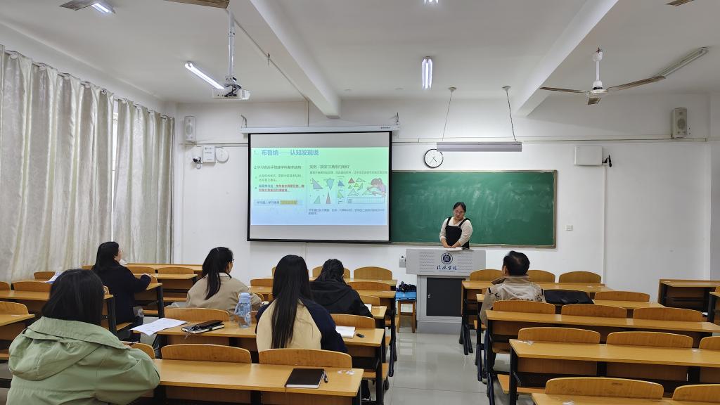 首先,娄冰老师作了题为《认知主义学习理论》的专题讲座。她系统阐述了该理论的核心观点、主要代表人物及其核心思想,并重点辨析了认知主义与行为主义的区别。讲解过程中,她结合“三角形内角和”等具体教学案例,生动阐释了学生在学习过程中的主动建构作用,引导学生将理论应用于高效解决复杂问题的实践之中。