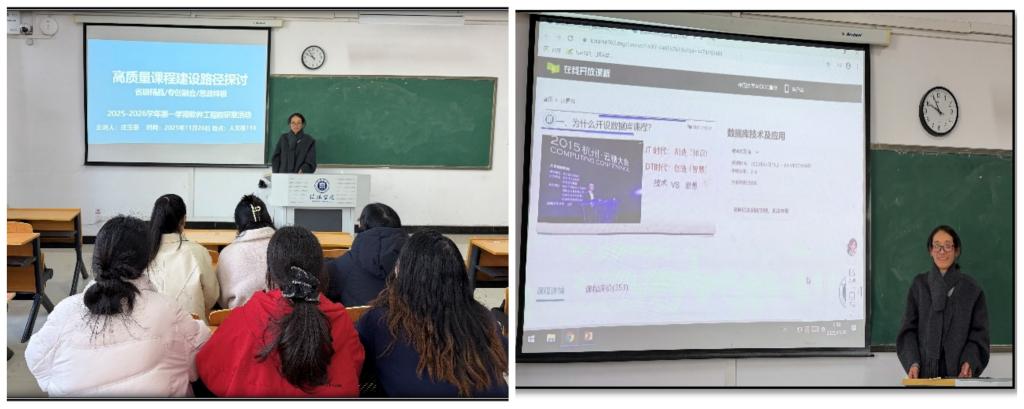 为系统推进教育教学改革,构建高水平人才培养体系,2025年11月26日10:00-11:40,大数据与人工智能学院软件工程教研室举办“高质量课程建设路径探讨”专题研讨活动。本次活动聚焦 “省级精品为体、专创融合为翼、思政样板为魂”三大核心路径,为未来课程建设指明了清晰方向。庄玉册老师作主旨汇报,系统阐释了“三位一体”的融合模型与实施策略。