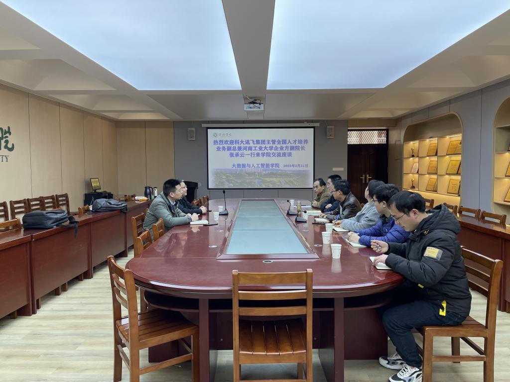 为进一步深化校企合作和产教融合,2023年2月21日上午在数计楼407会议室,科大讯飞集团主管全国人才培养业务副总兼河南工业大学人工智能产业学院企业方副院长张承云一行来我院交流座谈。大数据与人工智能学院院长邬长安、教学副院长黄俊、党总支副书记毛凤翔以及负责学院教学、实践、实习等工作的相关教师参加了交流座谈会。