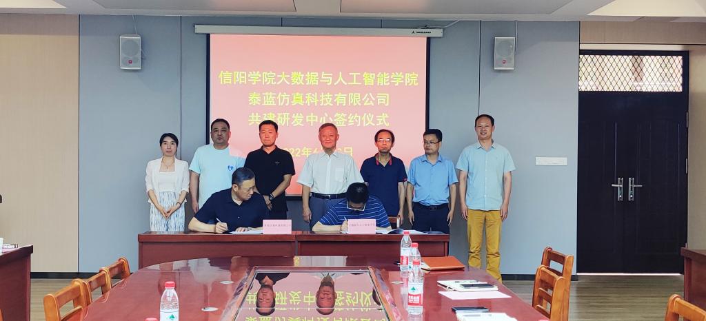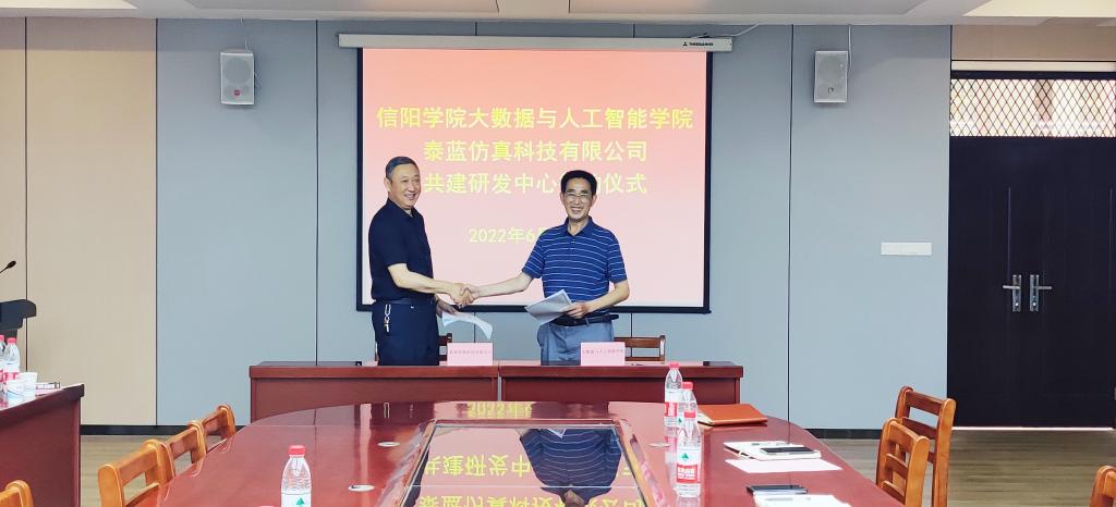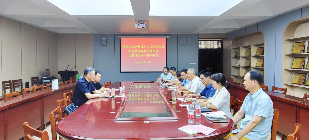 6月23日,我校与信阳泰蓝仿真科技有限公司共建研发中心签约仪式在学校数计楼407会议室举行。我校副校长王强,信阳泰蓝仿真科技有限公司书记张辉、办公室主任李松峻出席签约仪式。大数据与人工智能学院院长邬长安、副院长黄俊、教学秘书贾彦茹、学工干事鄢杰、大数据与人工智能研究所所长张冬松、实验中心主任倪天伟、教务员陈致超等参加了签约仪式。党总支副书记毛凤翔主持了签约仪式。