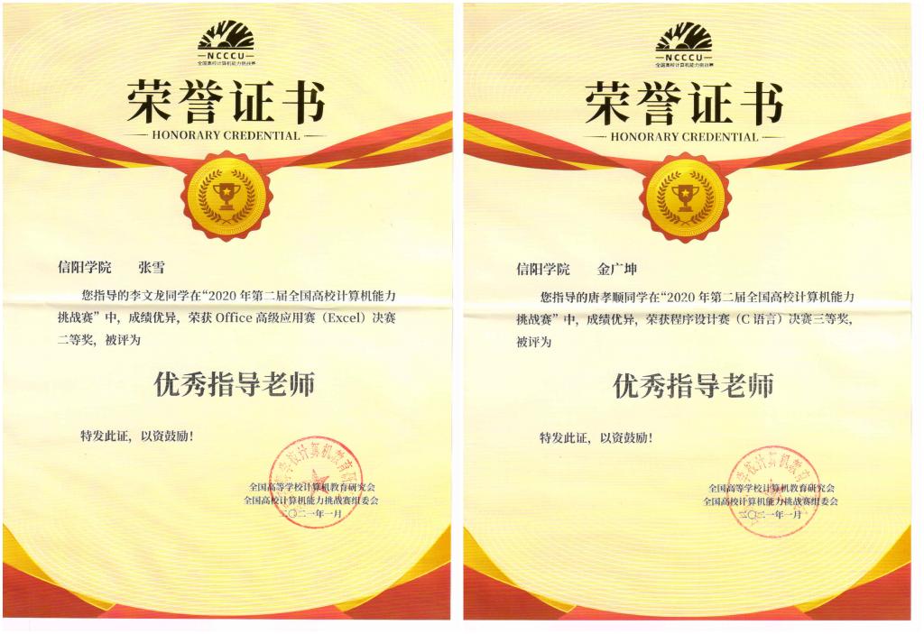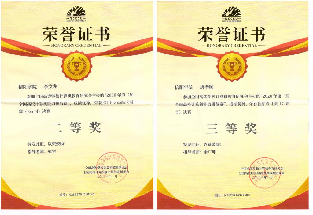 在第二届全国高校计算机能力挑战赛中,大数据与人工智能学院的参赛学子经过区域赛、国赛两轮的激烈角逐,喜获佳绩。其中在华中赛区的区域赛中,获得二等奖2项,三等奖6项,优秀奖8项,在国赛决赛中2020级计算机科学与技术本科2班李文龙,获得Office高级应用(Excel)决赛二等奖;2018级计算机科学与技术本科1班唐孝顺获得程序设计大赛(C语言)决赛三等奖,教师张雪、金广坤被评为优秀指导老师。