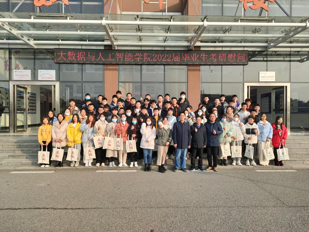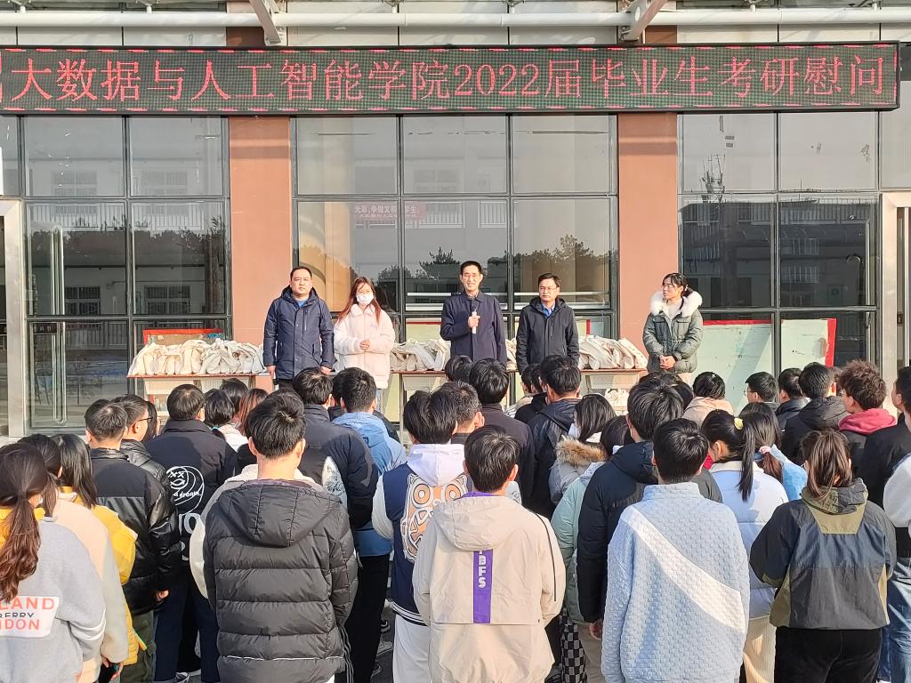 为让2022届考研备考同学坚定考研信念,自信走进考场,12月14号下午,大数据与人工智能学院在数计楼前开展2022届考研学生慰问活动。院长邬长安,党总支副书记毛凤翔,行政干事司杰,学工干事鄢杰,毕业班辅导员张雯参加了此次活动,活动由鄢杰主持。
