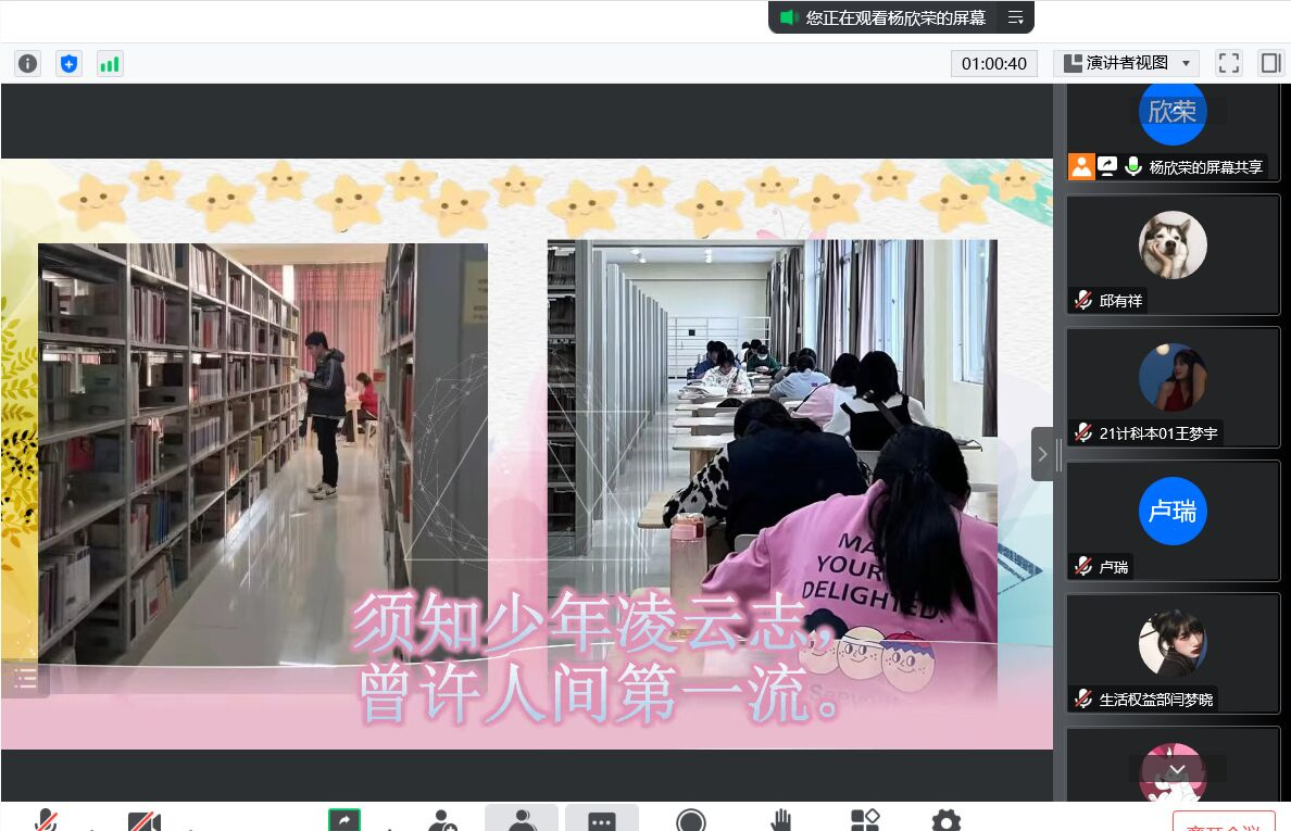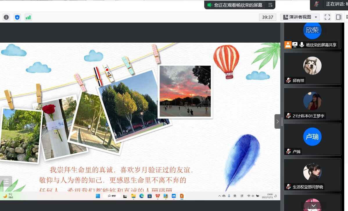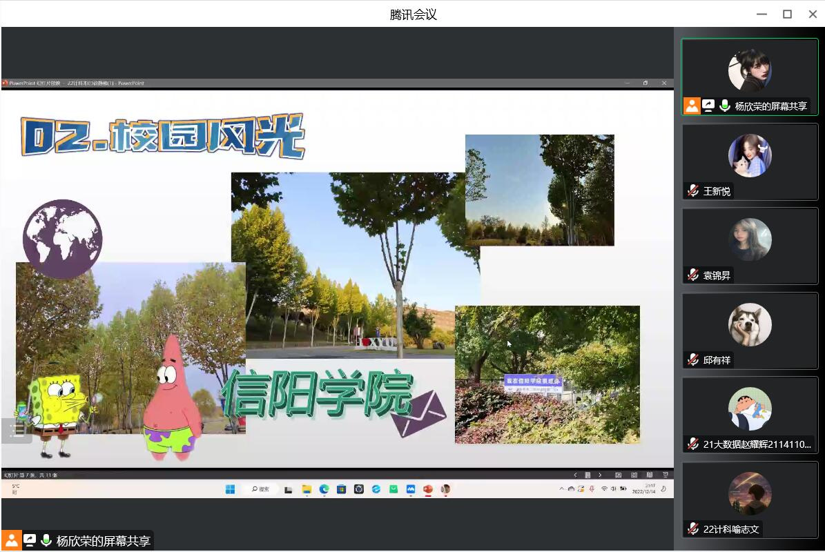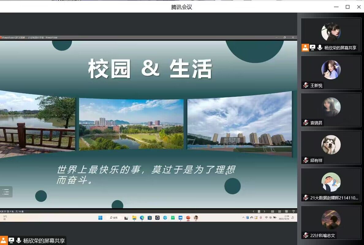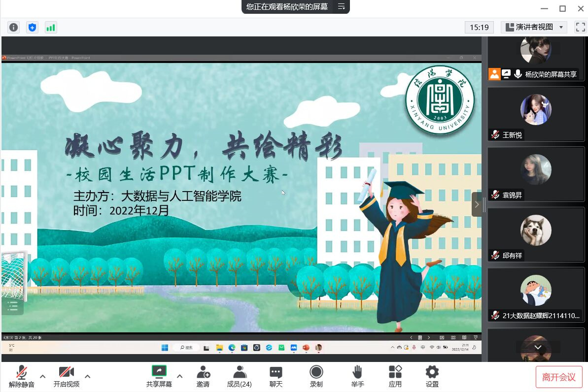 为丰富学生的校园生活,加强学生专业能力的培养,发挥学生的创造力,提高广大同学PPT制作水平,12月14日晚,大数据与人工智能学院在线上开展了“凝心聚力共绘精彩”校园生活PPT制作大赛。大赛由院学生会执行主席邱有祥主持,全体辅导员老师担任评委。