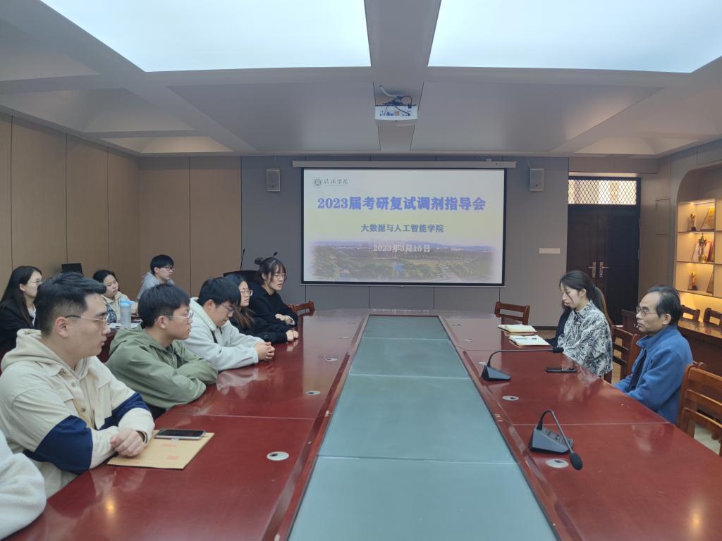 为了更好的帮助我院2023届考研学子科学准备复试,掌握复试与调剂技巧,帮助学生顺利考取心仪的学校,3月15日上午,学院在数计楼407会议室组织召开考研复试与调剂指导会。大数据与人工智能学院教学副院长黄俊、毕业班辅导员代亚南、赵冉及2023届考研学子参加了此次指导会。