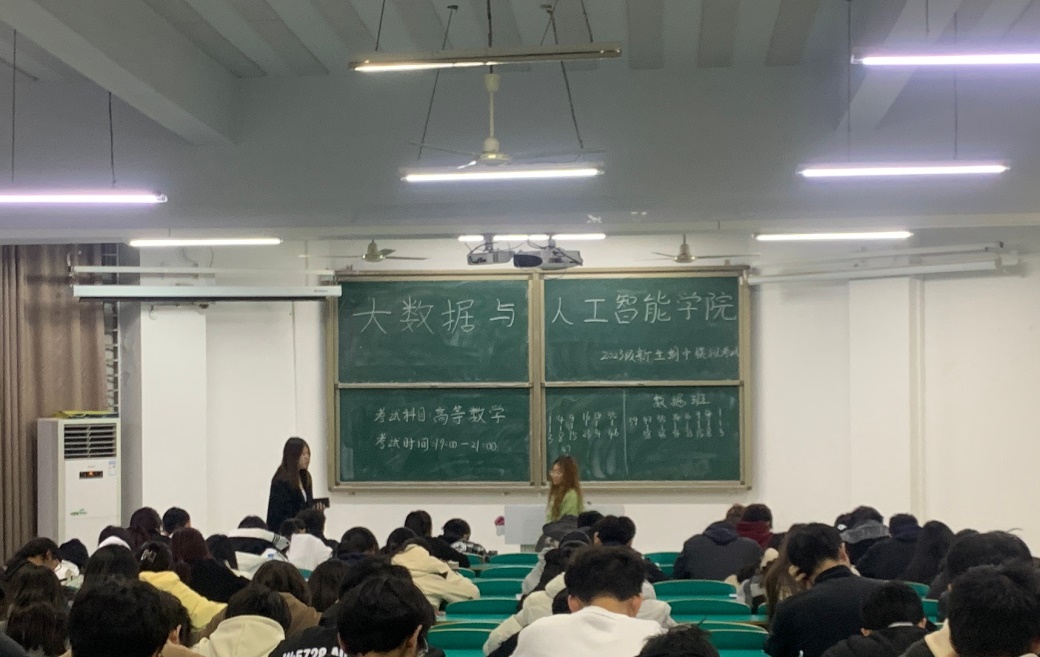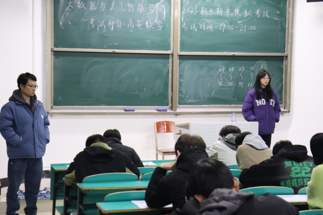为检测新生对所学知识的掌握情况,根据学校《关于开展2023年度学风建设月活动通知》的指示精神,12月5日至6日晚,大数据与人工智能学院在数计楼105、106、107教室组织2023级新生举行了期中模拟考试。学院领导高度重视此次期中模拟考试,学工干事鄢杰安排制定期中模拟考试的总体目标,由学院辅导员老师黄礼祥、刘明珠部署落实。