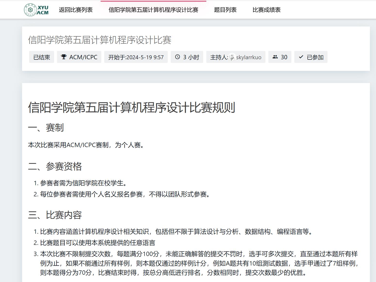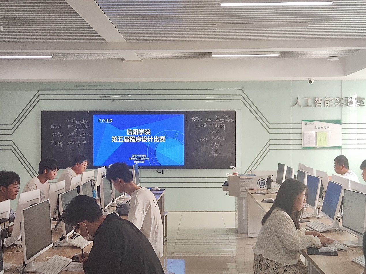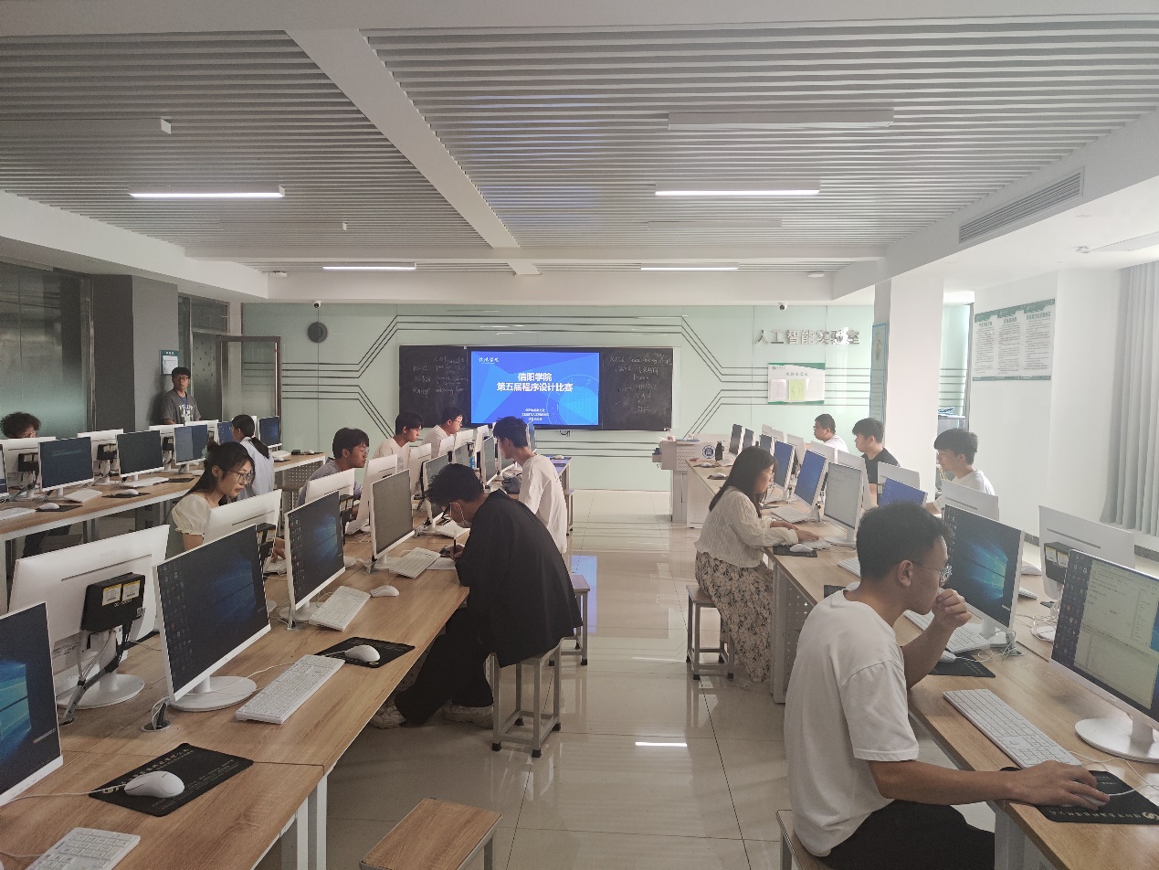 为了进一步促进我校优良学风建设,营造良好的校园科技文化氛围,发挥第二课堂在大学生创新教育中的作用,增强大学生的动手能力和创新能力,提高我校广大学生的计算机程序设计水平,2024年5月19日,大数据与人工智能学院于创新创业大厦实训中心503举行了第五届大学生计算机程序设计大赛。比赛共有30位来自多个专业和年级的选手参加,由计算机协会会长郭珉诚主持,徐良老师监督进行,采用机器计分方法,当场统计出比赛最终结果。