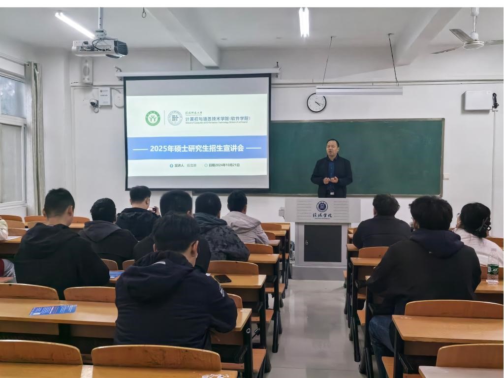 2024年10月21日,大数据与人工智能学院成功举办了信阳师范大学考研招生宣讲会。此次宣讲会邀请到了信阳师范大学计算机与信息技术学院副院长李艳灵教授、研究生招生负责人段雪源博士,大数据与人工智能学院2025届全体在校考研学生参加了此次宣讲会,宣讲会由大数据与人工智能学院计算机教研室主任贾彦茹主持。