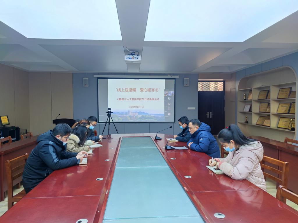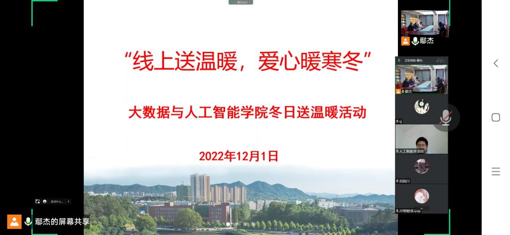 为深入宣传党和国家有关高校家庭经济困难学生资助政策,了解并掌握经济困难学生的家庭状况和受助需求,把党和国家对家庭经济困难学生的关怀落实落细,建立有效的家校联系渠道。12月1日上午,大数据与人工智能学院开展了“线上送温暖,爱心暖寒冬”慰问活动。学院党总支副书记毛凤翔、学工干事鄢杰、全体辅导员和受助学生参加了此次活动。