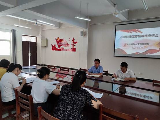 6月22日下午,大数据与人工智能学院在数计楼407会议室召开本学期心理健康工作辅导员座谈会。大数据与人工智能学院党总支副书记毛凤翔、学工干事李进、团总支书记鄢杰、全体辅导员参加会议,会议由李进主持。
