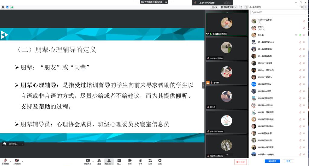 6月16日晚上,大数据与人工智能学院在腾讯会议举行第十二届“5•25”心理健康活动月线上心理健康教育讲座。讲座由大数据与人工智能学院心理顾问张金鑫老师主讲,心理辅导站站长李书林、心理健康部全体成员、各班级班长、心理委员及宿舍长(心理信息员)聆听讲座。