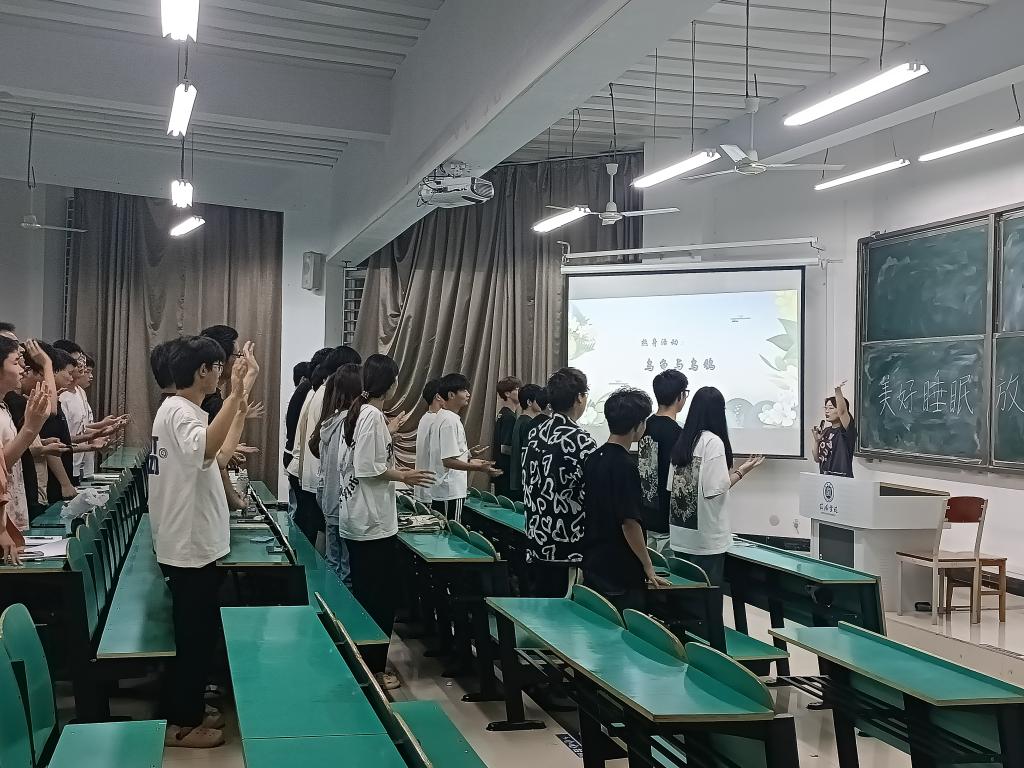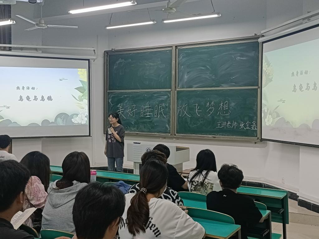 讲座开始,张金鑫老师与学生进行了“乌鸦与乌龟”的游戏互动,在放松身心的同时,引出了本次心理健康教育讲座的主题,张老师带领学生了解关于睡眠的数据,讲解国际社会公认的三项健康标准,让大家意识到睡眠的重要性,然后讲座内容分“ 睡眠知多少?”“你失眠吗?” “失眠了,该怎么办?”三个部分进行。