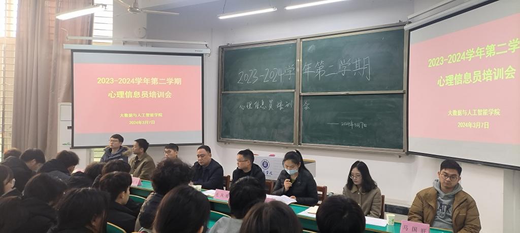 2024年3月7日中午,大数据与人工智能学院在数计楼105举行2023-2024学年第二学期心理信息员培训会。大数据与人工智能学院党总支副书记毛凤翔、学工干事鄢杰、全体辅导员和各班心理信息员参加了培训。