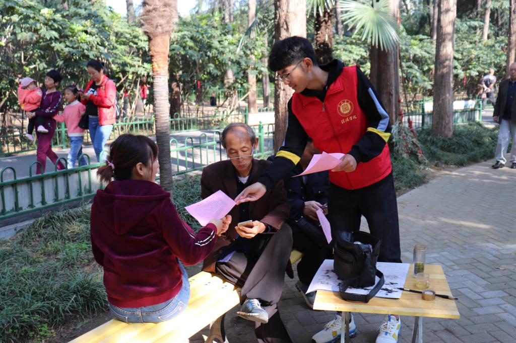 10月21日上午,大数据与人工智能学院学工干事司杰带领“青春助力精准扶贫”志愿服务队在浉河公园举办“扶贫日”宣传活动。