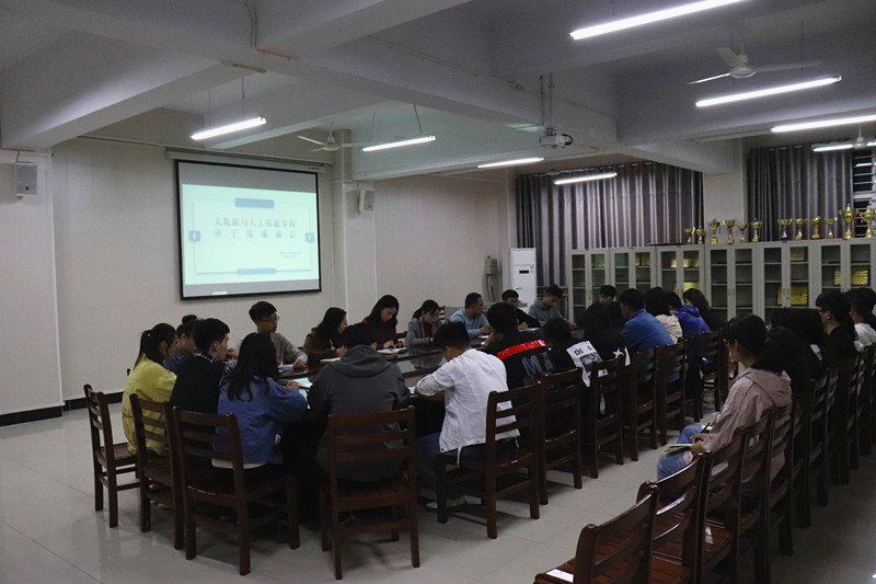 10月24日晚,大数据与人工智能学院在数计楼407会议室召开学生干部座谈会,学工干事司杰、团总支书记鄢杰、辅导员曹晶晶、曹晴阳、学生会负责人及全院各班学生干部代表参加会议。会议由学生会主席岳昊旻主持。