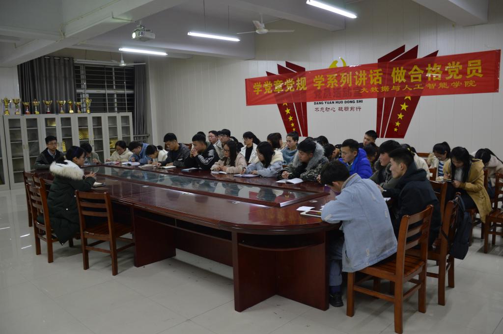 为深入学习贯彻党中央在党员中开展“学党章党规、学系列讲话、做合格党员”学习教育活动的要求,推动党内教育从“关键少数”向广大党员拓展,加强党员的思想政治建设。12月3日晚,大数据与人工智能学院于407会议室开展了“深入学习和贯彻落实‘两学一做’”主题党课培训。此次党课培训由学工干事兼学生党支部书记司杰主讲,全体党员发展对象以及入党积极分子参加了此次培训。