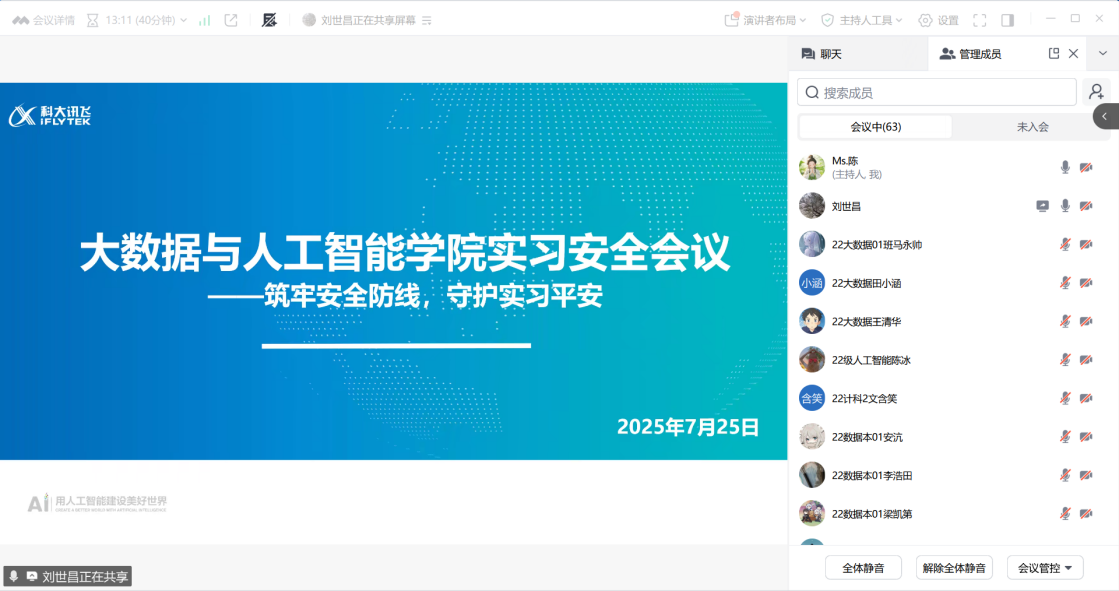 为切实保障2025年暑期实习学生的人身安全与权益,大数据学院于7月25日召开线上实习安全专题会议。实习领导小组、实习指导教师及全体实习学生参会,围绕"强化安全意识、严守管理规范、筑牢安全防线"主题展开部署,全力护航学生实习安全。