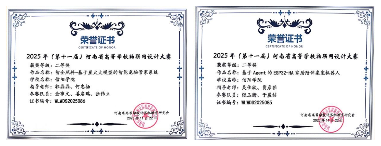 我校大数据与人工智能学院高度重视此次赛事,精心选拔5名优秀学子组建2支代表队参赛。经过作品展示、设计思路汇报、现场答辩等多环节的激烈比拼,学校两项参赛作品“基于星火大模型的智能宠物管家系统”和“基于Agent的ESP32-HA家居陪伴桌宠机器人”脱颖而出,均斩获大赛二等奖。