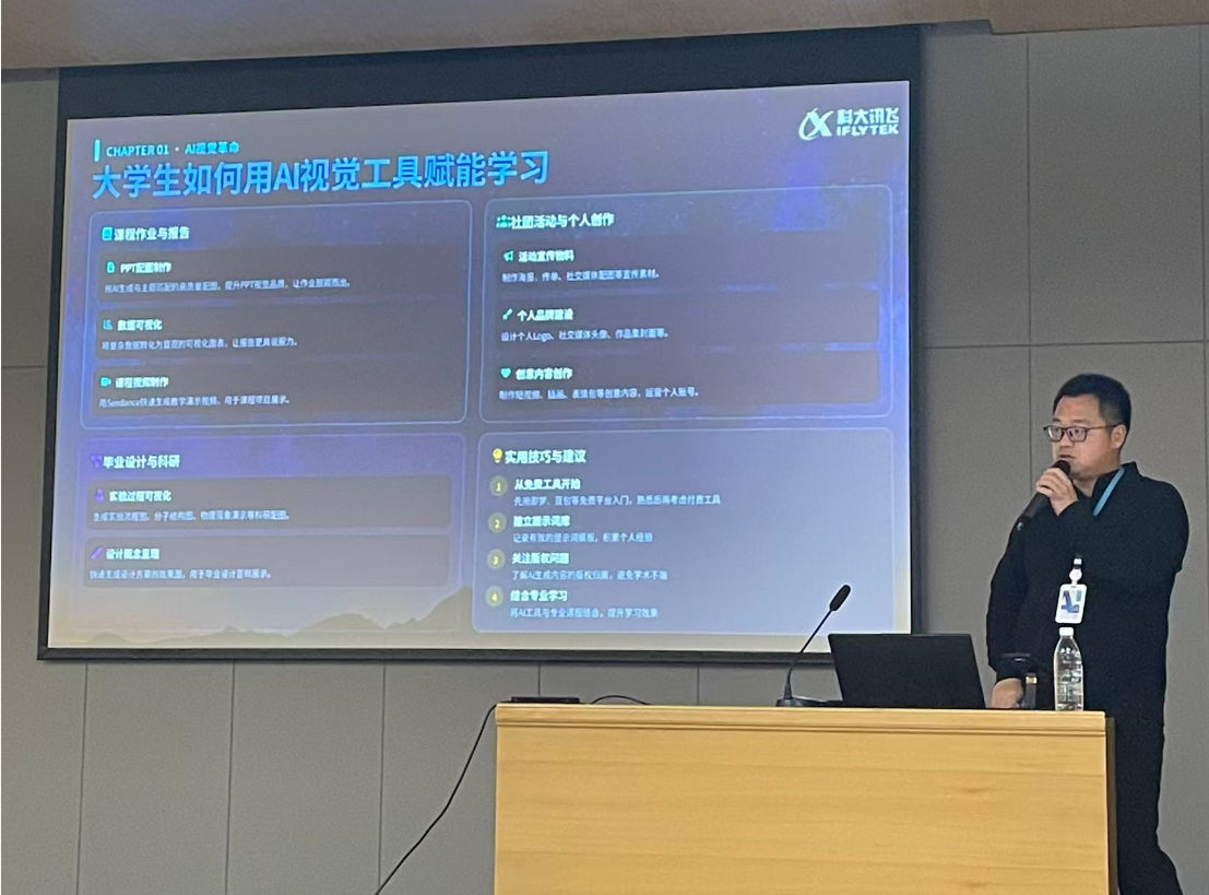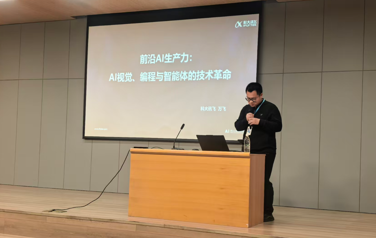 为拓宽师生学术视野、紧跟人工智能技术发展前沿,进一步赋能学校专业教学创新,4月14日上午,太阳成集团tyc33455ccww特邀科大讯飞高级算法工程师万飞在浉河校区图书馆101报告厅作题为“前沿AI生产力:AI视觉、编程与智能通的技术革命” 的专题学术报告。全校200余名师生共同聆听了本次报告。报告由学院教学副院长毛凤翔主持。