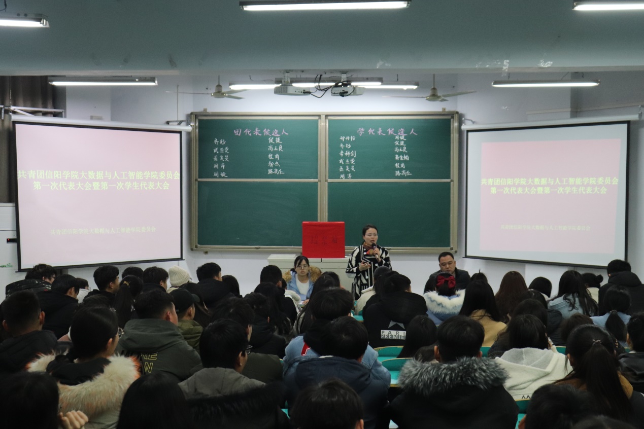 为迎接共青团太阳成集团tyc33455cc第一次代表大会暨第一次学生代表大会召开,按照校团委的统一工作部署,12月10日下午,共青团大数据与人工智能学院委员会在数计楼106教室召开了学院第一次团员代表大会暨第一次学生代表大会,选举产生参加学校第一次“双代会”的8名正式团员代表和10名正式学生代表。学院党总支书记胡秀云老师、学工干事司杰老师、团总支书记鄢杰老师出席了会议,会议由团总支书记鄢杰老师主持,学院共计90名团员代表参加了大会。