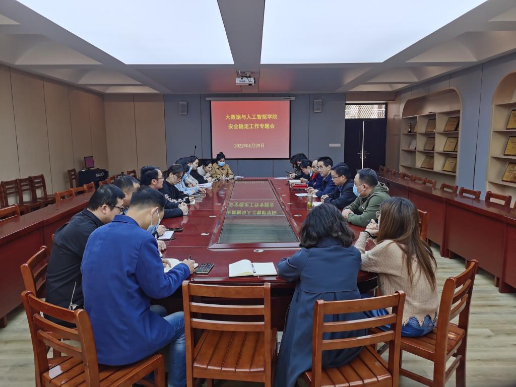 为深入落实河南省教育系统安全稳定工作视频会议精神,切实做好 “五一”假期师生疫情防控和安全教育管理工作,4月29日上午,大数据与人工智能学院在数计楼407会议室召开假期安全工作部署会。院长邬长安、党总支副书记毛凤翔、教学副院长黄俊、教学秘书贾彦茹、行政干事司杰、学工干事鄢杰和教研室负责人以及全体辅导员参加了会议。会议由毛凤翔主持。