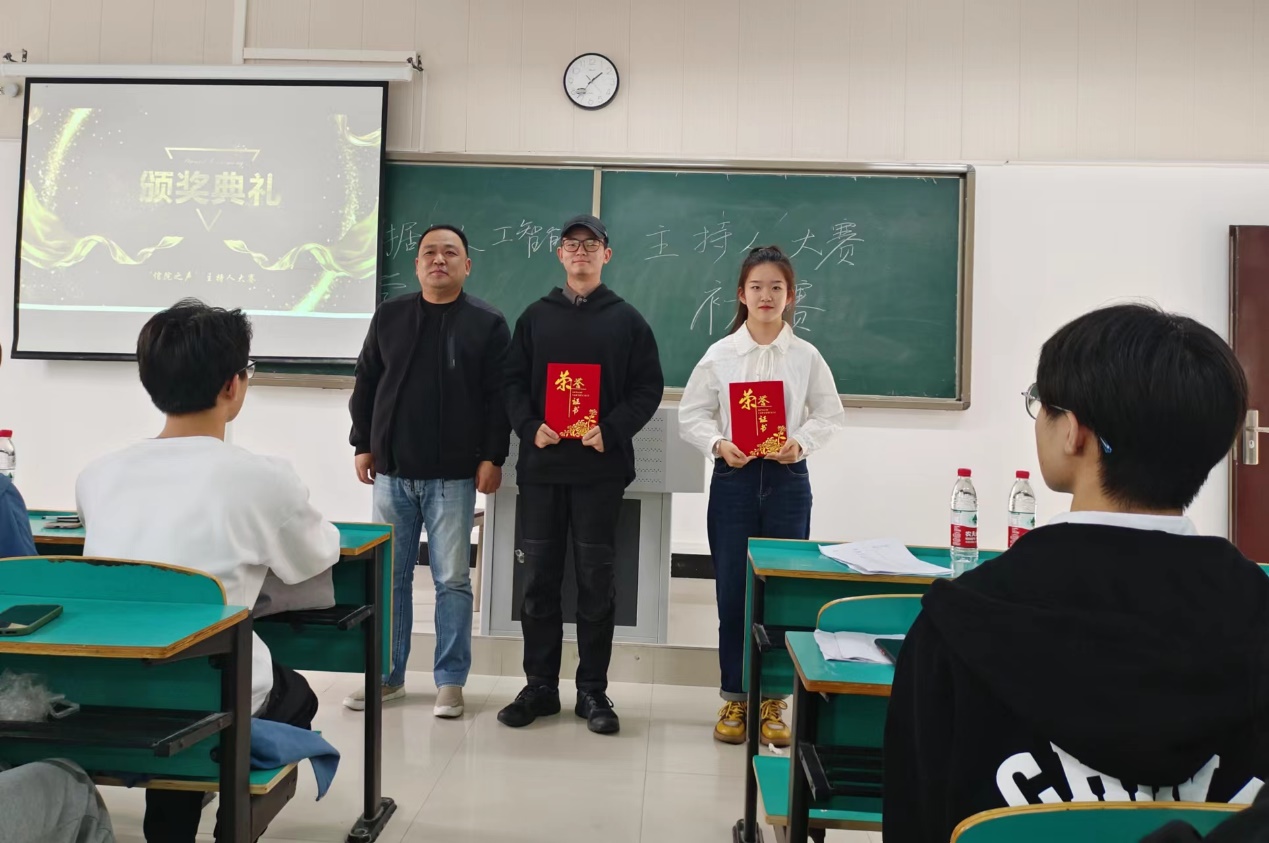 比赛中,选手们充满着青春的激情与活力,创意层出不穷,各显身手,风趣幽默的自我介绍,创意感十足的主持稿件,更有让人眼前一亮的吉他弹唱。选手们在现场展现自我魅力,张扬青春姿态,优秀的表现赢得现场的评委和观众的阵阵掌声。经评委仔细商讨,结合每位选手的上台的综合表现,最终评出一等奖两名,二等奖四名,三等奖六名,由鄢杰和沈鹏超老师为获奖选手颁发了荣誉证书并合影留念。