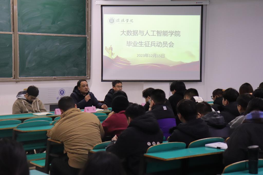 为积极响应国家大学生征兵入伍号召,切实做好毕业生征兵工作,12月15日下午,大数据与人工智能学院在数计楼105教室召开2024届毕业生征兵宣传动员会。学院党总支副书记毛凤翔、学工干事鄢杰和毕业班辅导员参加了会议。会议由鄢杰主持。
