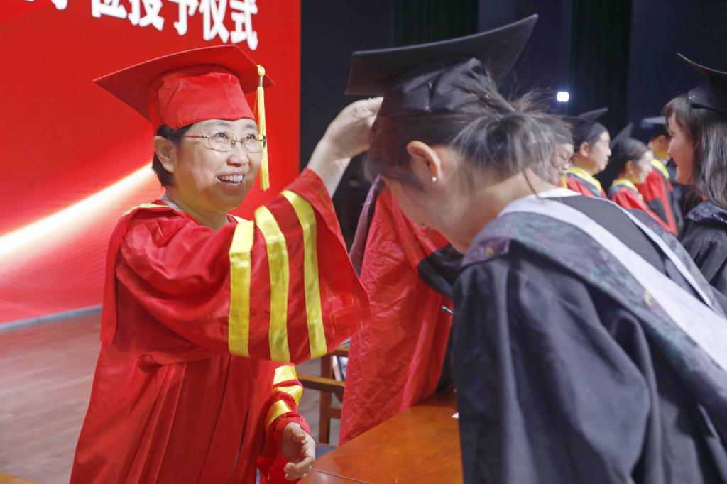 副院长毛凤翔宣读《太阳成集团tyc33455cc关于授予2024届本科毕业生学士学位的决定》,校领导、专家教授们为毕业生代表正冠拨苏,授予学士学位。
