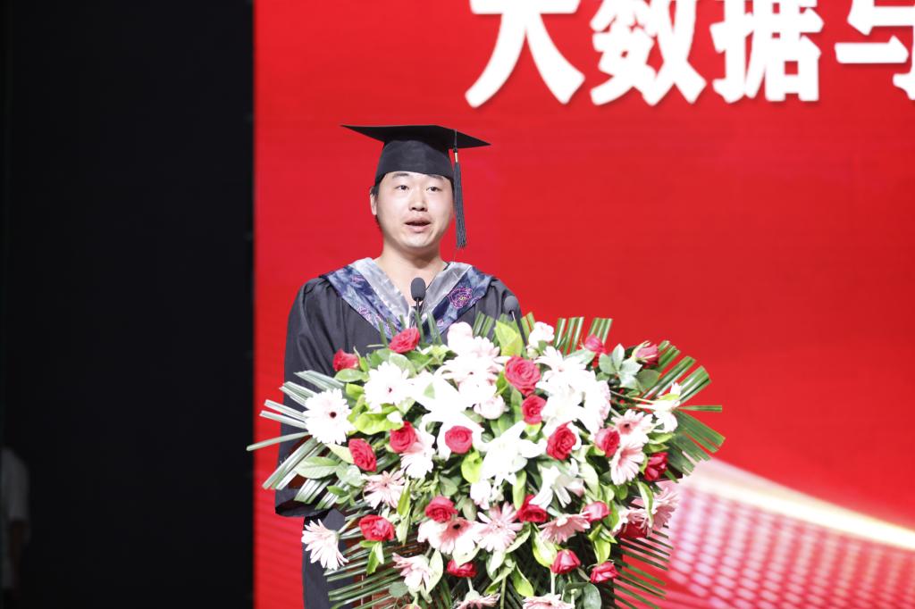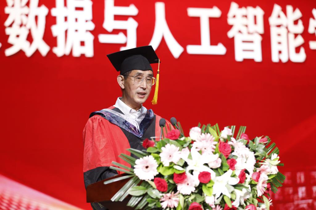 院长邬长安发表了毕业致辞,他首先代表学院向圆满完成学业的毕业生表示祝贺,2024届毕业生既是大数据与人工智能学院发展的见证者,更是大数据与人工智能学院发展的参与者、实践者、贡献者与推动者。邬长安院长对在人生的重要转折点即将开启新征程的同学们提出几点希望:一是希望同学们坚定理想,胸襟开阔,奋发有为。今年恰逢中华人民共和国成立75周年,我国正在朝着“第二个百年”奋斗目标迈进的重要时期,同学们生逢其时,重任在肩,在实现自我价值的过程中,要把自己自觉融入到社会发展、国家发展的进程中。只要坚定理想信念,不畏困难,积极探索,不懈奋斗,一定能够有所作为,大展宏图。 二是希望同学们勇于担当,善于学习,开拓进取。在大数据,云计算、人工智能等新技术快速发展的时代,作为信息人,同学们要勤于学习、善于思考,好读书,读好书,不断地从他人、从书本、从媒体、从实践中学习知识,武装自己,把握时代脉搏,陶冶情操品格,增强能力本领。三是希望同学们脚踏实地,严谨务实,追求卓越。“路虽远,行则将至;事虽难,做则必成。”同学们既要有远大理想,更要有扎扎实实、埋头苦干的奋斗精神,扎扎实实走好每一步,认认真真做好自己的每一件事,一步一个脚印,砥砺前行,在前进中追求卓越。