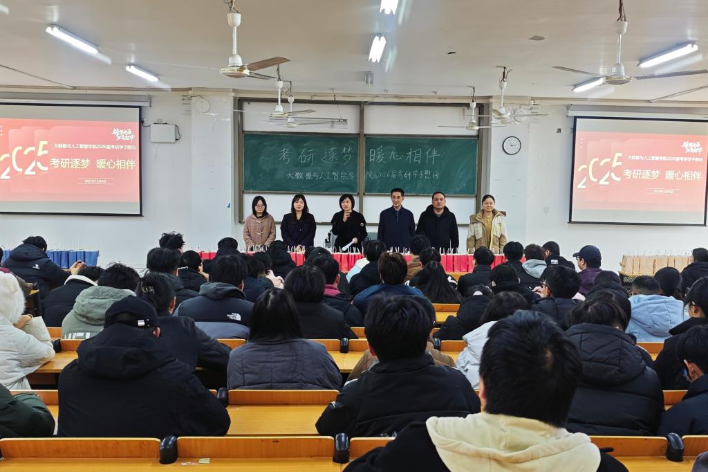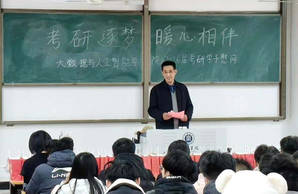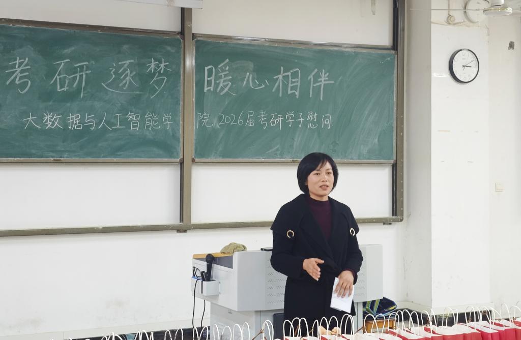 为助力2026届考研学子坚定信心、缓解备考压力,12月4日下午,大数据与人工智能学院于人文楼106教室开展“考研逐梦,暖心相伴”2026届考研学子慰问活动。学院院长邬长安、党总支书记高昌慧、学工干事鄢杰、全体毕业班辅导员以及2026届考研学生参加本次活动。活动通过暖心祝福、鼓励寄语与物资支持,为学子送上全方位关怀,现场氛围温馨而振奋。
