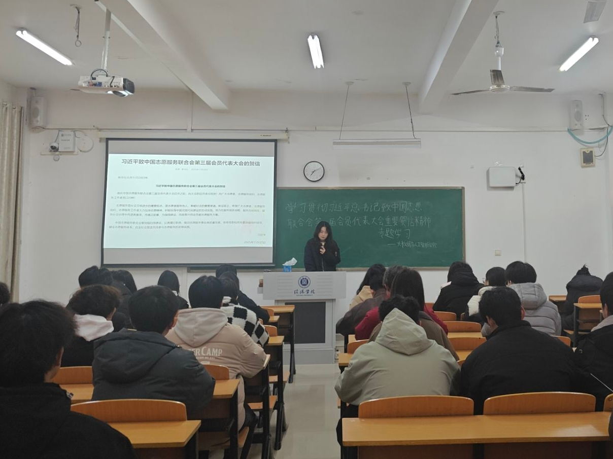 国歌奏毕,学院团总支副书记宋妍带领全体成员逐字逐句学习习近平总书记致中国志愿服务联合会第三届会员代表大会重要贺信精神,围绕贺信中对志愿服务事业的肯定、对青年志愿者的期望展开深入领学,解读了志愿精神与时代发展、青年成长的内在联系,让大家深刻领会贺信精神的核心要义与实践要求。