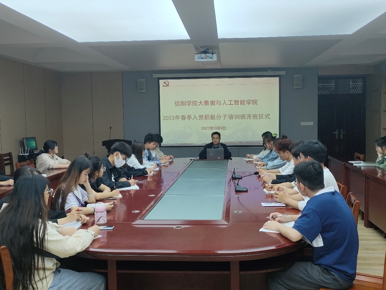 为使入党积极分子不断筑牢信仰之基、补足精神之钙、把稳思想之舵,推进学生党员队伍建设的系统化、规范化和科学化,切实提高大学生党员发展质量,大数据与人工智能学院于2023年5月9日在数计楼407会议室举办了2023年春季入党积极分子培训班开班仪式暨《新时代 新担当 新作为》专题党课。学院党总支副书记毛凤翔、2023年春季入党积极分子参加了此次的开班仪式,开班仪式由毛凤翔主持。
