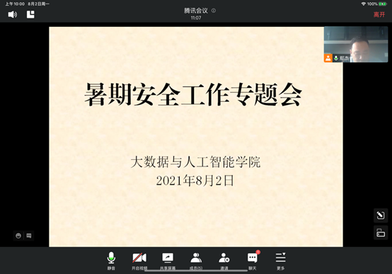 根据学校下发的《关于进一步加强学生安全教育管理工作的通知》文件要求,结合学校召开的疫情防控专题视频会议精神要求,8月2日上午,大数据与人工智能学院党总支副书记毛凤翔组织学院学工负责人和全体辅导员老师召开了暑期安全工作专题会,部署了近期的相关工作。