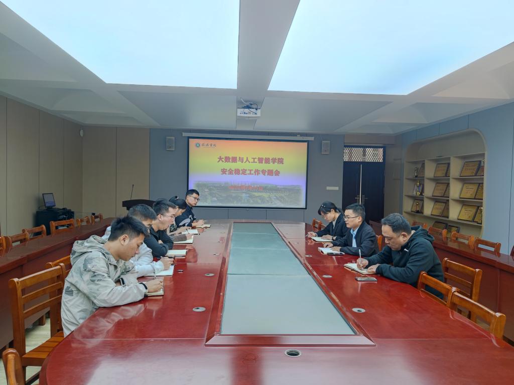 为全面贯彻落实河南省教育系统中秋国庆“双节”安全稳定工作视频会议的精神,落实学校安全稳定工作会议的要求,确保师生生命财产安全,保障校园安全稳定。9月25日上午,大数据与人工智能学院在数计楼407会议室召开安全稳定工作专题会,学院党总支副书记毛凤翔、行政干事司杰、学工干事鄢杰和全体辅导员参加了会议。