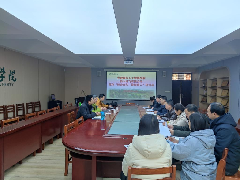 1月12日上午,大数据与人工智能学院在数计楼407召开深化“校企合作、协同育人”研讨会。科大讯飞有限公司区域总监韩海鹏、区域经理章永祥,工程师李奎,大数据与人工智能学院院长邬长安、党总支副书记毛凤翔、各教研室主任和教师代表参加了此次研讨会。会议就人才培养方案及合作具体内容展开了交流。